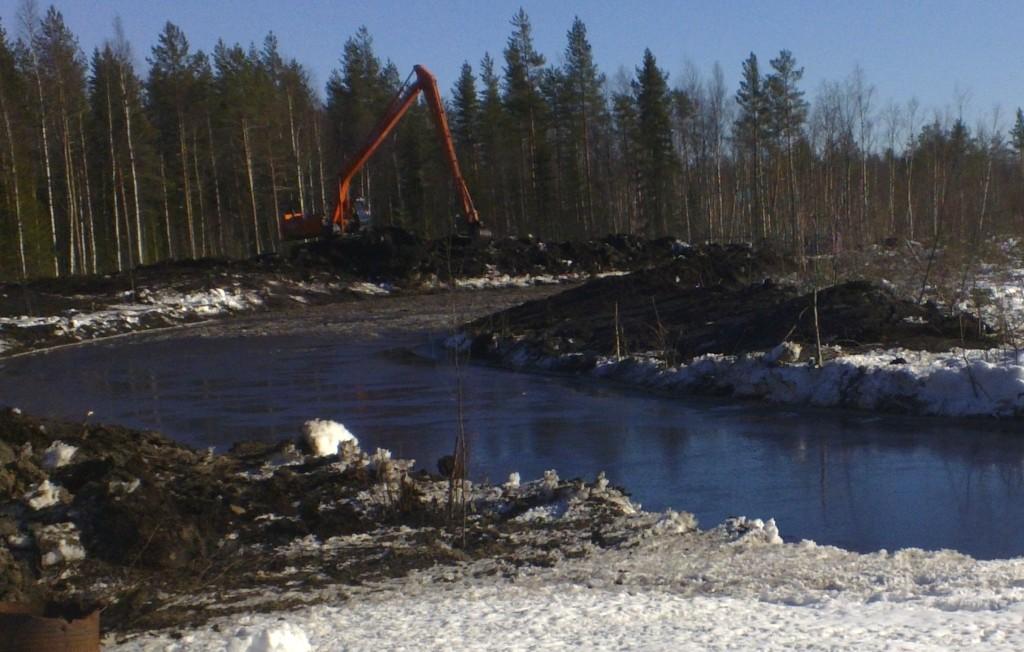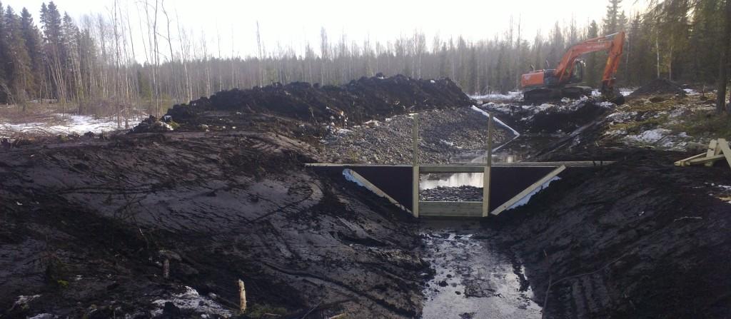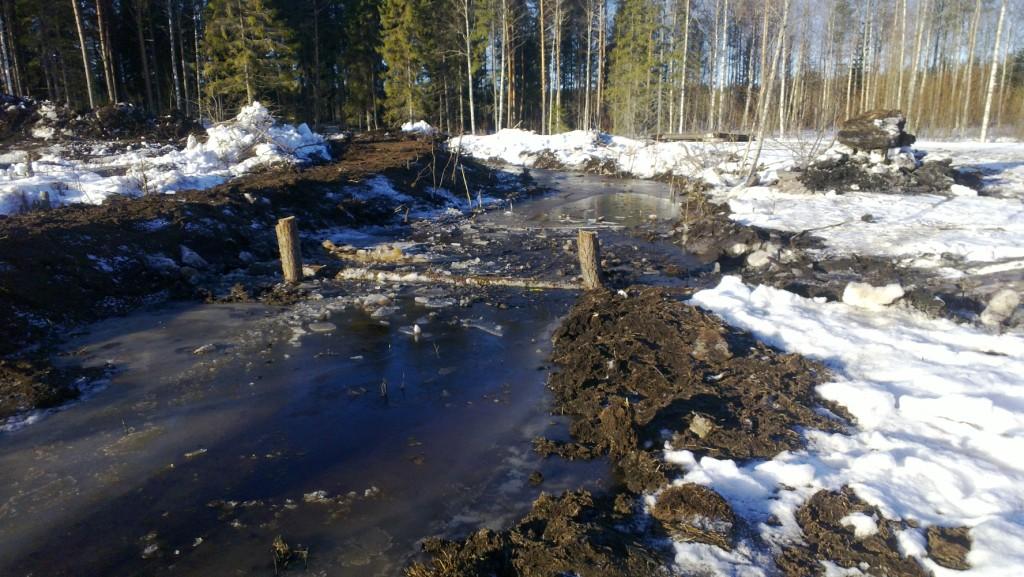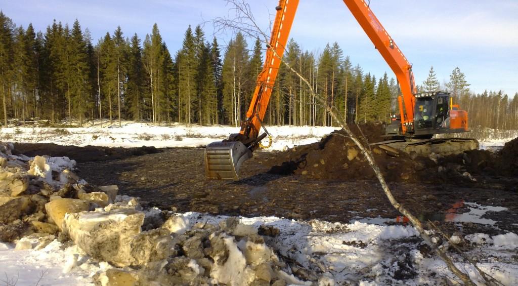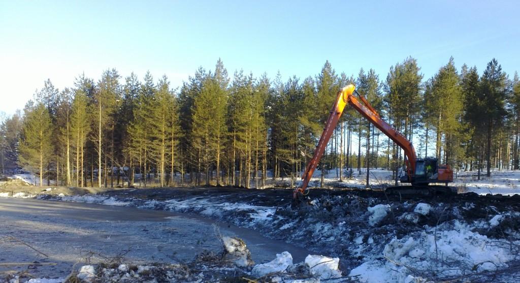 Talvityöt Kalamäessä valmistunevat tällä viikolla. Viime maanantaina Saarisenojaan voimalinjan kohdalle tehtiin pieni hirsirakenteinen pohjakohouma.