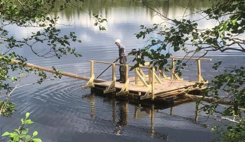 Puomi palautettiin paikalleen tehtävää varten rakennetulla lautalla. Lautta on koottu pääasiassa bioremediaatiotutkimuksesta vapautuneista tarvikkeista.