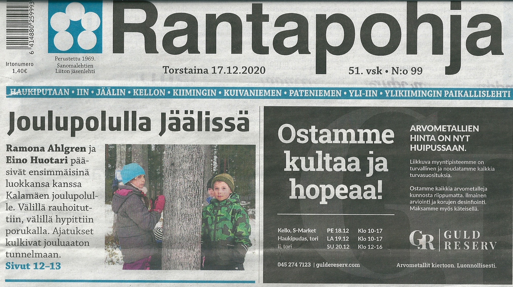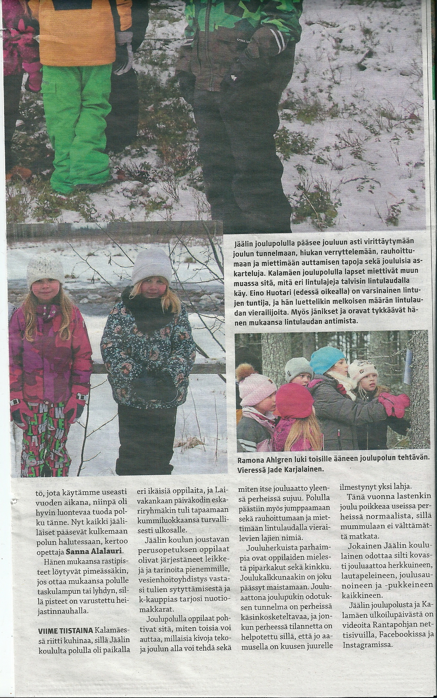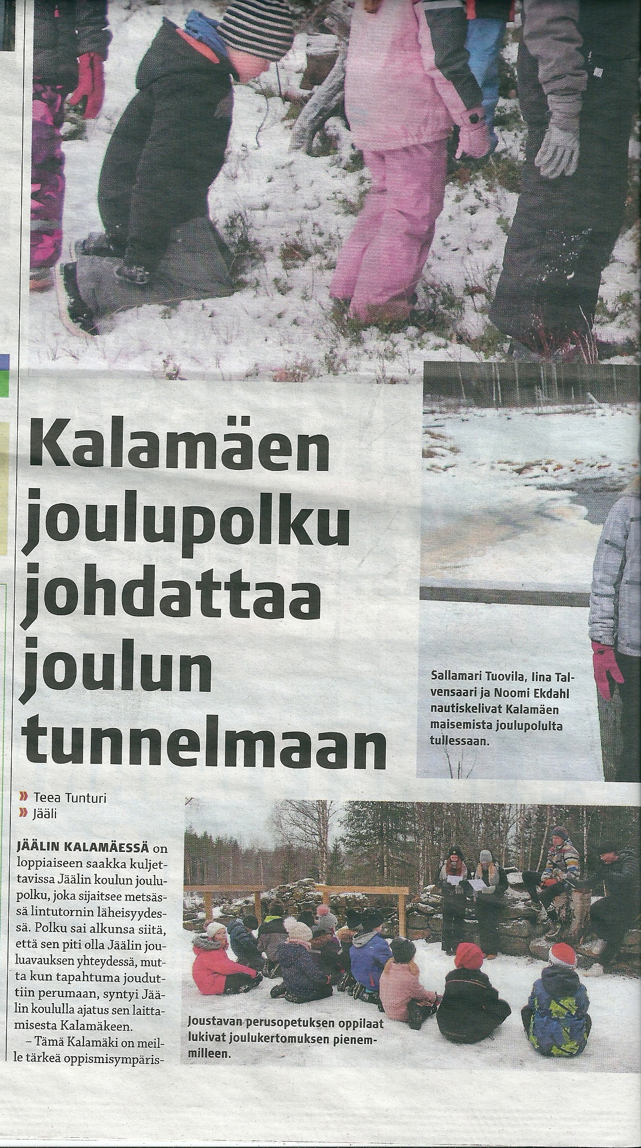 Lapsille on tarjolla Kalamäen joulupolku loppiaiseen saakka. Rantapohja kertoi tästä laajassa jutussaan. Hankkeen puuhanainen, opettaja Sanna Alalauri kiittelee vuolaasti Kalamäkeä oppimisympäristönä ja kertoo, että Kalamäkeä käytetään vuoden aikana useasti. Koulun joulupolkutapahtumaan osallistui eri ikäisiä oppilaita aina eskareista alkaen. Joulupolku on yksi jääliläisen yhteistyön ilmentymä. Vesienhoitoyhdistys hoiti nuotion, paikallinen kauppias tarjosi makkarat ja joustavan perusopetuksen oppilaat järjestivät ohjelmaa. Rantapohjan juttu on luettavissa alla olevista leikkeistä.
