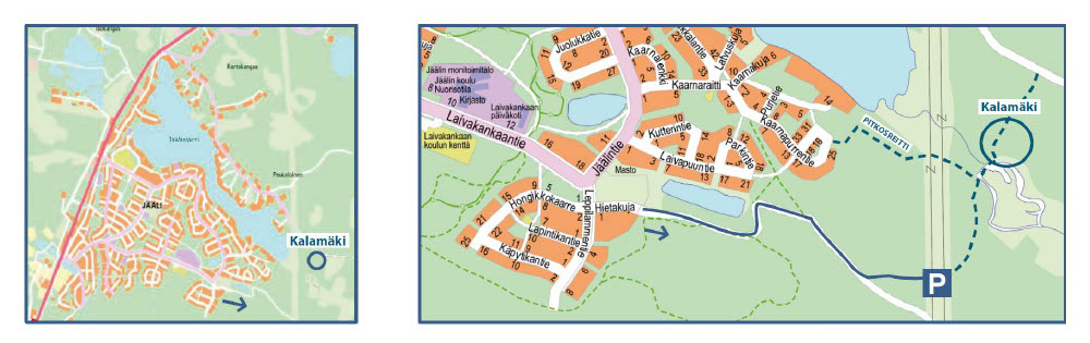 Ensisijainen reitti Kalamäkeen on opastettu Hietakujalta (Laivakankaantie/Jäälintie -Leppilammentie – Hietakuja). Pysäköintipaikoista on niukkuutta. Sen vuoksi toivotaan, että osallistujat tulisivat paikalle mahdollisuuksien mukaan jalan tai pyörillä. Opastetut kävely- ja pyöräreitit lähtevät myös Kaarnapurrentieltä ja Heikkisentien jatkeelta.
