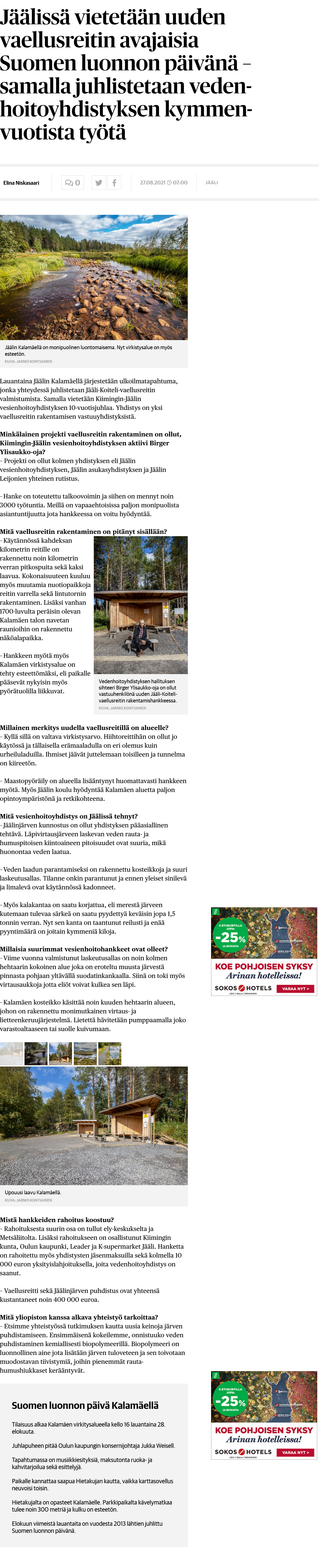 Rantapohja kertoo laajassa jutussaan ”Kymmenen vuotta omalle järvelle” Jääliläisten omatoimisuudesta sekä järvikunnostuksen että Koiteli-reitin toteuksen kautta. Lehti haastattelee eri toimijoiden edustajia. Juhlajärjestelyyn osalllistuvat Kiimingin -Jäälin vesienhoitoyhdistyksen lisäksi Jäälin asukasyhdistys, LC Jääli, Jäälin koulu, Jäälin Martat ja Kiimingin seurakunta. Jutun nettiversion teskti on luettavissa täältä: