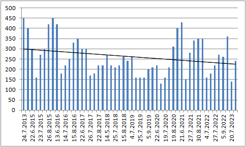 Jäälinjärven vesi on taas tummaa. Parin viikon aikana on satanut 120 millimetriä, ja se näkyy järvessä kahdella tavalla: vesi on korkealla ja se on tummaa. Viimeksi 20. heinäkuuta otetussa näytteessä järviveden väriarvo oli 240 mmt/l. Tuloveden väri Saarisenojassa oli samaan aikaan 760 mmPt/l. Parin viikon sadejakson aikana Jäälinjärveen on tullut vettä noin miljoona kuutiometriä. Tämä merkitsee sitä, että kaksi kolmasosaa järven vedestä on vaihtunut tummaan tuloveteen.