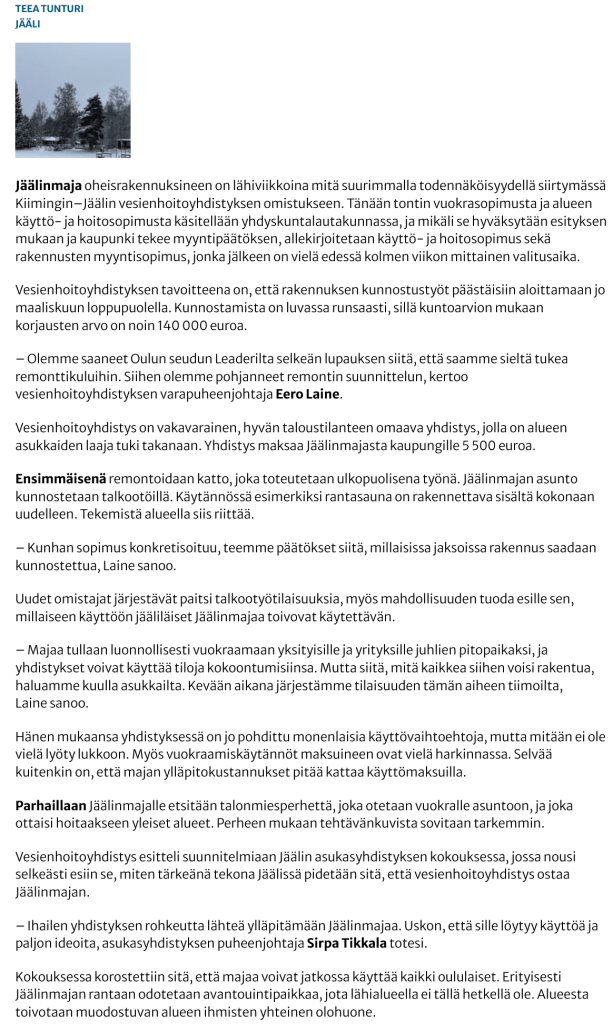 Oulun yhdyskuntalautakunta hyväksyi Jäälinmajaa koskevan sopimuskokonaisuuden 25.2. Kaupungin byrokratian vuoksi omitusoikeuden siirtyminen kestää vielä noin kuukauden.
